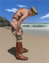 A-Bay follows the earlier and smaller sized painting, Off Duty Swim where the young soldier turns away from the viewer. Again featuring his popular muse Jamieson, this arresting painting offers the viewer his handsome profile, lost in solitary thought.