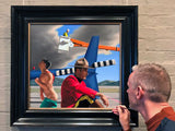 An actively dynamic composition draws the viewers gaze deeply into the multi-planed scene, providing a three dimensional depth of view to the rolling hills and the runway in the back ground landscape.