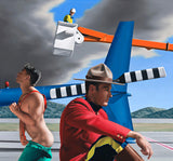 Horizontal elements include the distant figure in the cherry-picker and the tail of the helicopter which enter the composition from opposite sides with their complementary colours of orange and blue intersecting behind the central figure of the Canadian Mounty.