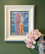 Warm golden light bathes the calm coastal scene in this exquisitely rendered and realistic artwork. The young solitary surfer appears lost in thought, wearing the artist's pale blue hoodie and a shot of short sun bleached blonde hair.