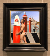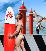Demonstrating a masterful composition, this striking new painting features a naked young surfer, Melbourne model Harry Hall, before a charming Venetian backdrop, which Watson observed on his last visit to the magical city of water and light.