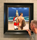Bright sunlight saturates the scene, a dark brooding sky and azure ocean providing a dramatic back drop to the soldier's scarlet jacket and exquisitely detailed uniform.