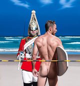 Still and alert, a Queens Life Guard stares straight ahead engaging the viewer. In dramatic contrast, naked and carefree Jamieson looks to his right surveying a pristine beach. Strikingly simple and direct in composition, the defined muscular buttocks and back of Jamieson sits in complete contrast to the formal intricate detail of the queens guard. Each subject displaying their unique eye-catching plumage - one guards the life of the Queen, his companion guards the lives of swimmers.