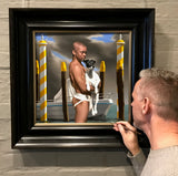 In this painting, bright sunlight illuminates the foreground against a moody sky in a dramatic and unmistakably Venetian setting, which captivated the artist when he visited Italy in 2011.