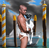 Proudly standing in the foreground a jock-strap clad man gently cradles a regal looking dog in front of a small cruising boat between mooring poles.  Flanked either side of the painting are more elaborate yellow and white candy-striped poles instantly locating the subjects to Venice.