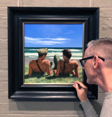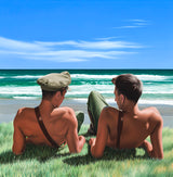 Two partially dressed soldiers, each retaining the Sam Brown over their shoulders are laying on a beach headland in front of sweeping waves. A quiet, relaxed intimacy exists between the two figures in this painting. Positioned achingly close but without touching, their body language and position of their gaze is suggestive of a romantic bond between the two. Perhaps they are captured immediately prior to a more physical embrace or shyly testing the intentions of the other.