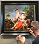 Watson’s masterful incorporation of Lambert within the composition creates an arching visual curve above the group, between Cupid and the bow, which introduces a curious ambiguity as to the target of Cupid's reaching. Given Watson never alters the proportions, or re-arranges figures within a classical artwork he is referencing, it is striking to to observe the seated dog looking longingly up to Lambert, whose luminous peaches and cream complexion compliments those of Diana and Cupid.