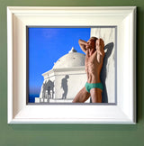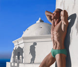 Evoking a still from a cinema screen, late afternoon light saturates this breathtaking and intriguing Greek scene, dominated by a handsome blonde sunbather who possesses the physique of a young Greek god.